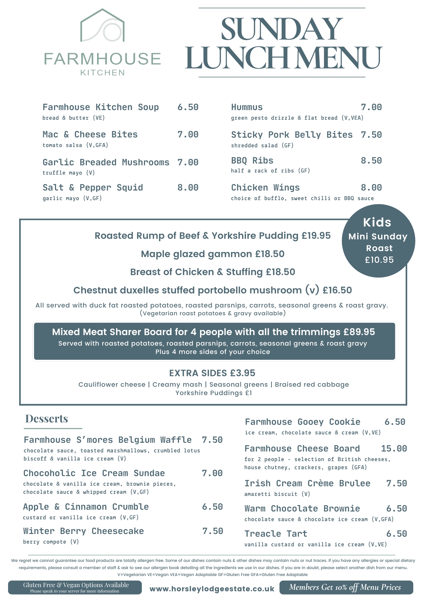 Our restaurant menu includes a selection of starters,mains and desserts. Please see the Sunday Lunch Menu.